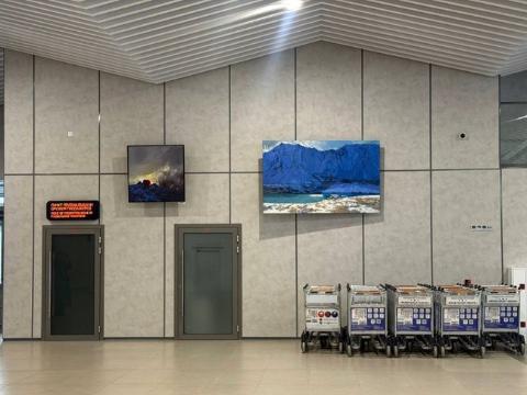 Главным экспонатом выставки является шестиметровое полотно, запечатлевшее зимний Байкал. Оно установлено в зоне прибытия пассажиров. Другие произведения художника выставлены в зале получения багажа.