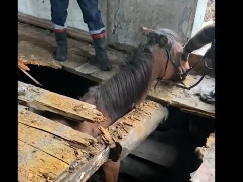 Прибывшие на место происшествия спасатели, чтобы освободить животное, приняли решение аккуратно вырезать часть напольного покрытия. Вначале инструмент был запущен вдали от места проведения операции, дабы дать возможность лошади адаптироваться к шуму. В это время владелец успокаивал и удерживал молодого коня. В результате конь сделал прыжок и сумел выбраться из образовавшегося отверстия.