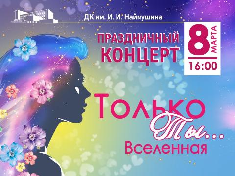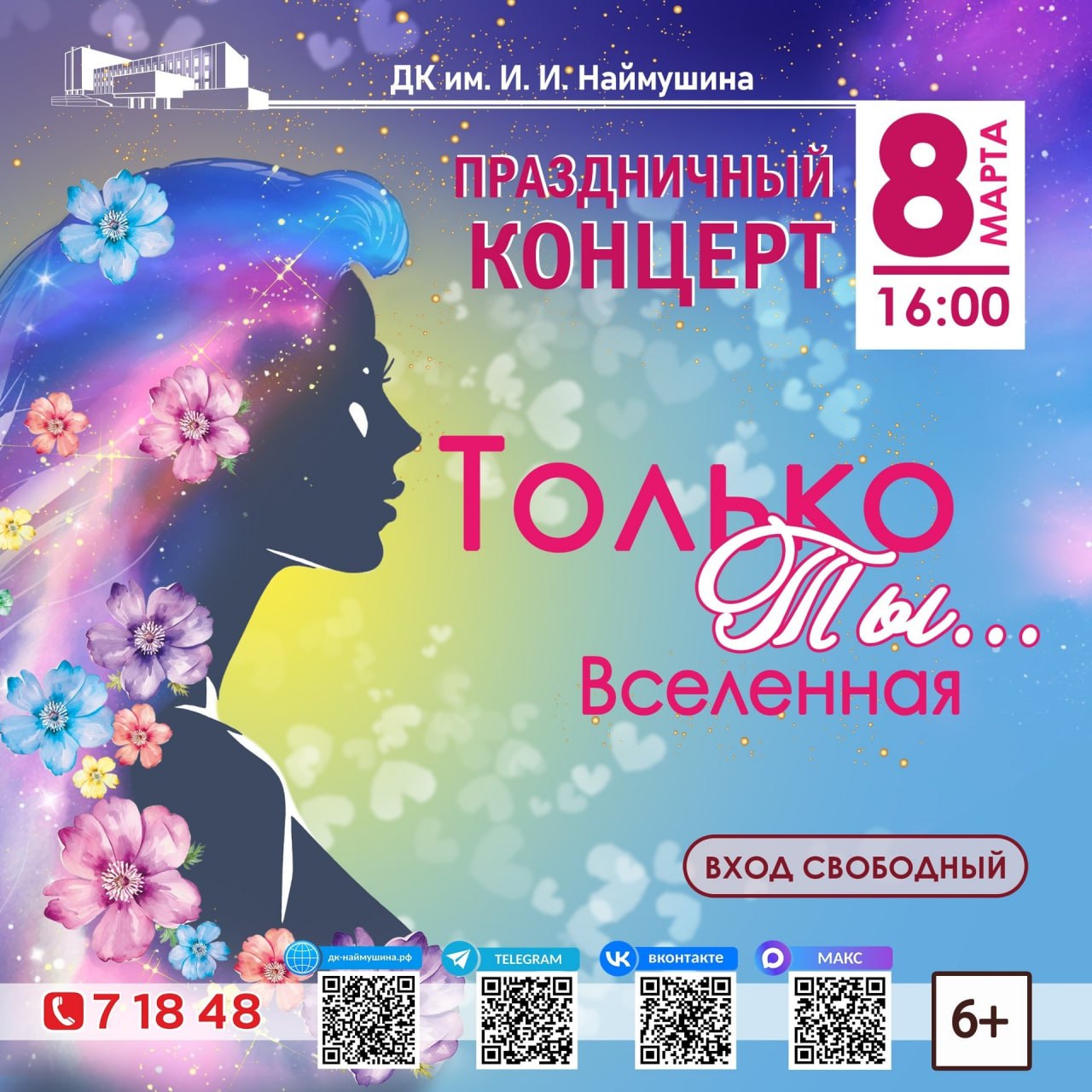 8 марта в 16:00 в ДК им. И.И. Наймушина пройдет концерт «Женщина – Вселенная!». Также все желающие смогут посетить здесь фотовыставку «Женщины в истории города»