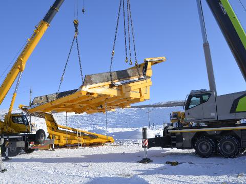 С помощью двух мощных кранов кузова устанавливаются на самосвал. Всё. Техника готова к эксплуатации. Этот и другие белорусские многотонники пополнят парк большегрузной техники, который задействован на опытно-промышленной разработке одного из крупнейших золоторудных месторождений мира - Сухой Лог.
