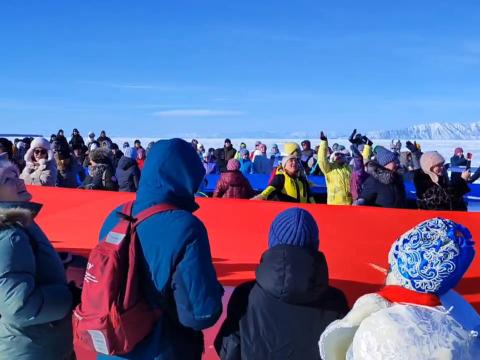 На льду Байкала они растянули гигантский флаг России. Всего в растяжке флага страны на льду приняло участие более 300 человек, в том числе актёры в костюмах Дед Мороза и Белого Старца. Видео здесь.