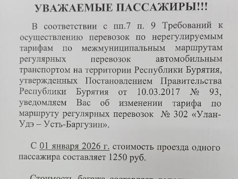 Жители поселка Усть-Баргузин выражают недовольство из-за повышения цен на билеты до Улан-Удэ. С 1 января 2026 года перевозчик повысит стоимость проезда по маршруту Усть-Баргузин - Улан-Удэ до 1250 рублей, в то время как сейчас цена составляет 1100 рублей.