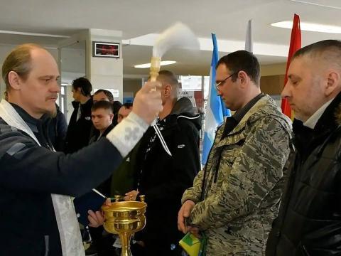 В Братске прошла церемония проводов на специальную военную операцию еще десяти человек, заключивших контракт с министерством обороны Российской Федерации. Местный священник Русской Православной Церкви благословил мужчин, которые также получили флаг города Братска и шеврон с гербом.