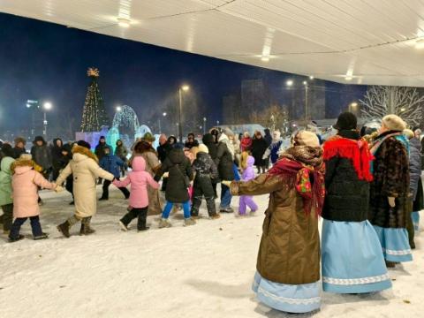 На Комсомольской площади Усть-Илимска развернулась настоящая дискотека в валенках, превратив обычный зимний вечер в народное гулянье. Люди всех возрастов объединились в едином порыве веселья и с азартом участвовали в народных забавах.
